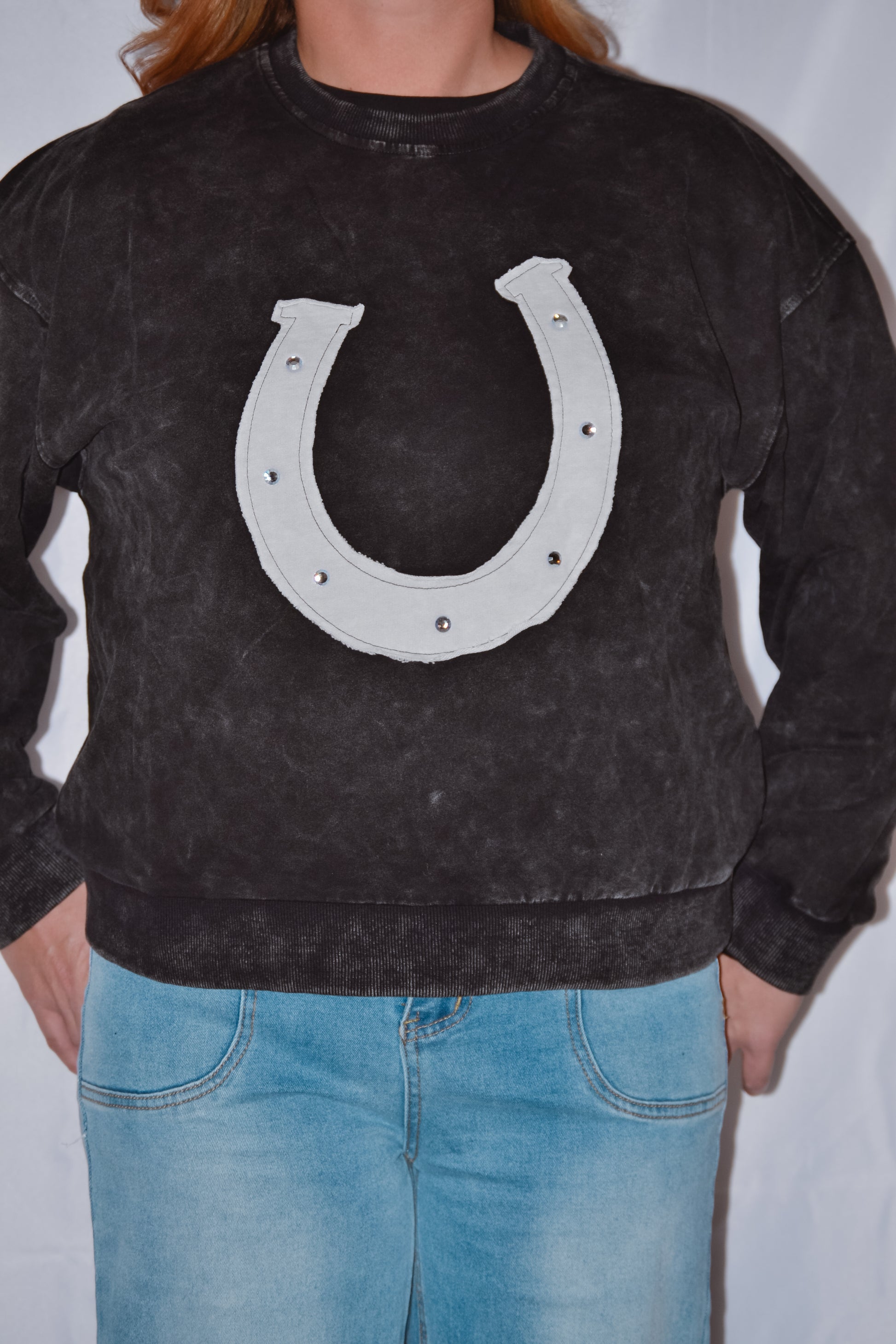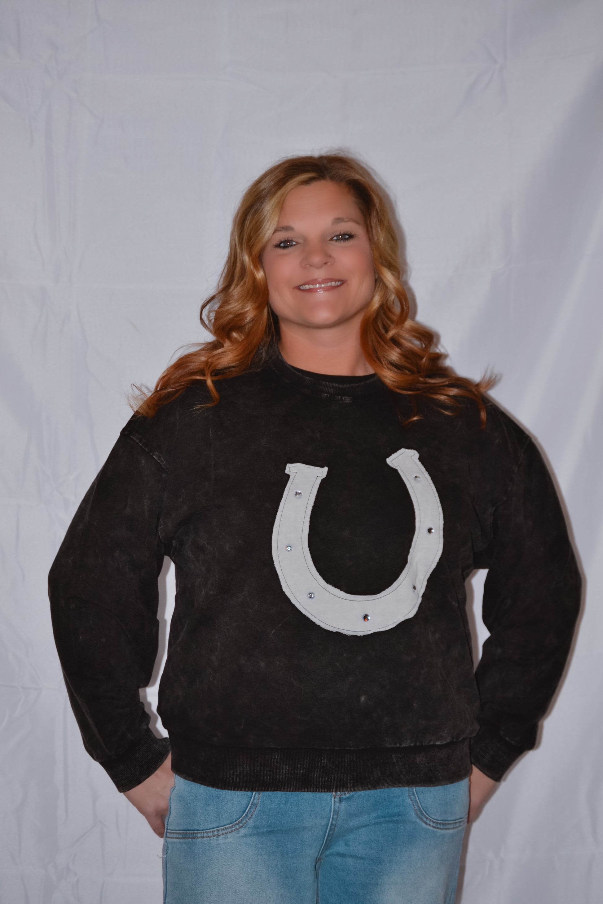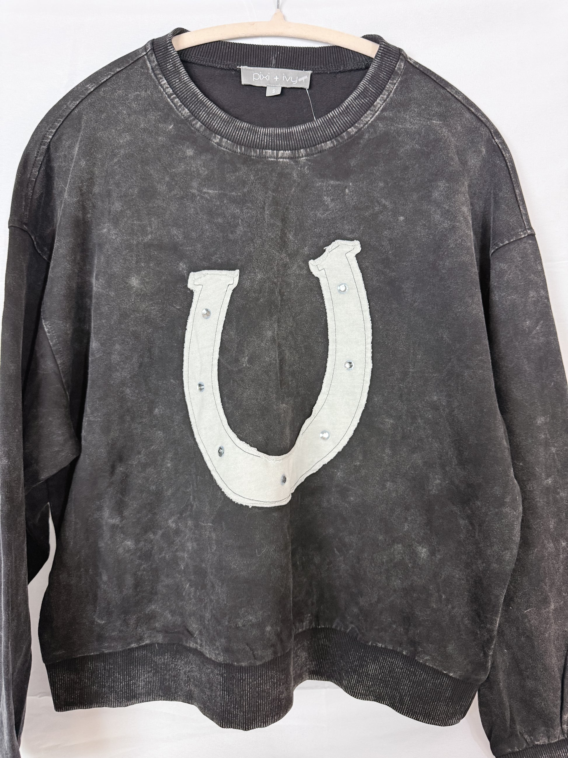 This cozy long sleeve mineral washed sweatshirt features a unique dazzling horseshoe appliqué with rhinestone accents. Stay stylish and comfortable in this year’s Western Trend.